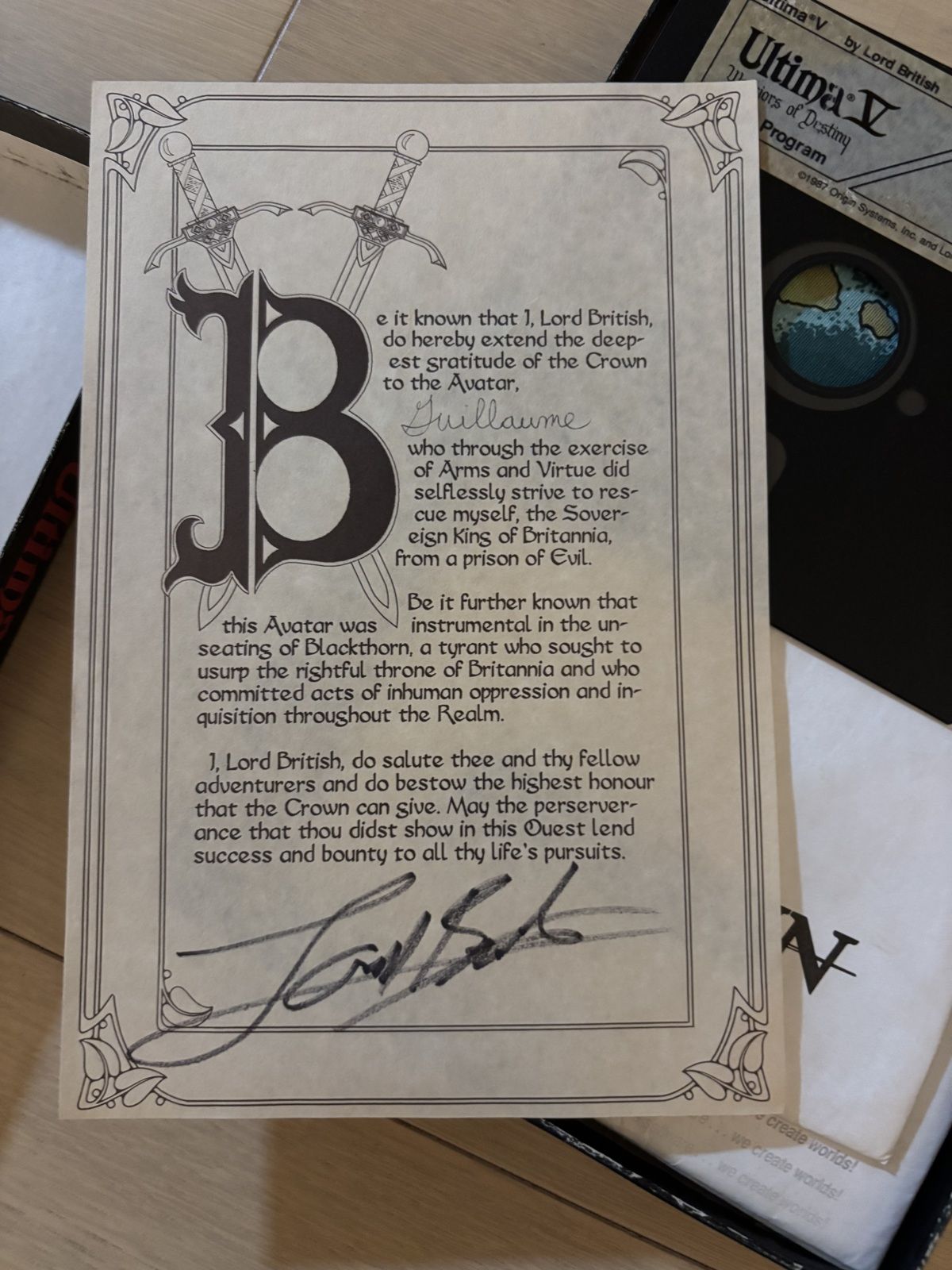 Jeu de rôle et jeux vidéo faisant souvent bon ménage, j'étais - et suis toujours- féru de jeux vidéo. Dès l'âge de sept ans, sur mon micro-ordinateur Apple IIc, je découvrais la magie immersive d'Ultima IV, puis d'Ultima V, dont je garde encore la boîte un peu mangée, et le parchemin de félicitations de Lord British, signé de sa main d'un feutre à bout de souffle. J'avais écrit aux studios d'Austin d'une belle lettre timbrée (eh oui nous n'avions pas d'e-mail à cette époque!), Texas, pour leur annoncer que j'avais terminé le jeu. C'était en 1990.